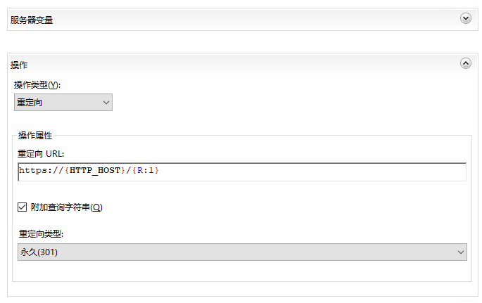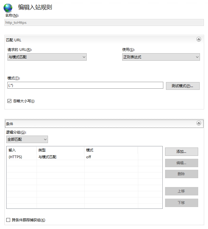 <rule name="http_toHttps" stopProcessing="true"> <match url="(.*)"/> <conditions> <add input="{HTTPS}" pattern="off" ignoreCase="true"/> </conditions> <action type="Redirect" redirectType="Permanent" url="https://{HTTP_HOST}/{R:1}"/> </rule>