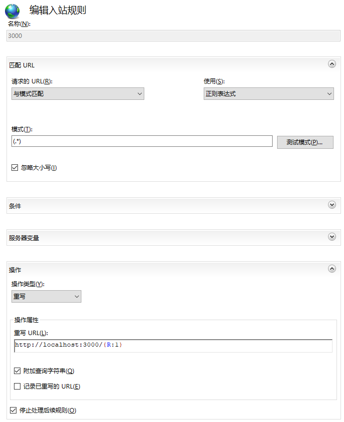 <rule name="3000" stopProcessing="true"> <match url="(.*)"/> <action type="Rewrite" url="http://localhost:3000/{R:1}"/> </rule>步骤3:创建 Windows 服务