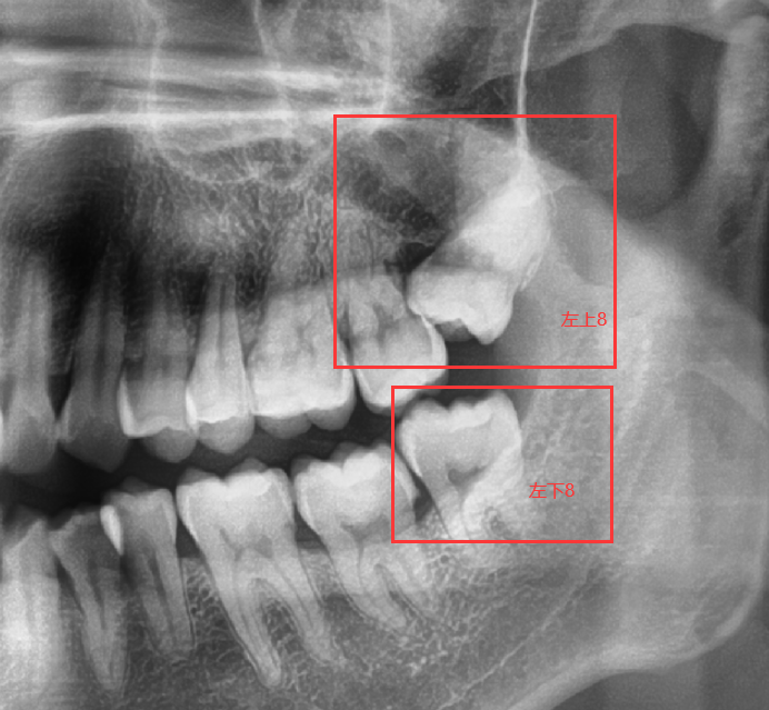 首先,如图,在某次洗牙赠送的口腔全景片中,发现了4颗智齿,相对比别人的智齿,我有2颗智齿位置还不错,另外2颗,就有点问题,今天着重说一下左侧2颗。如图:左上8和左下8。