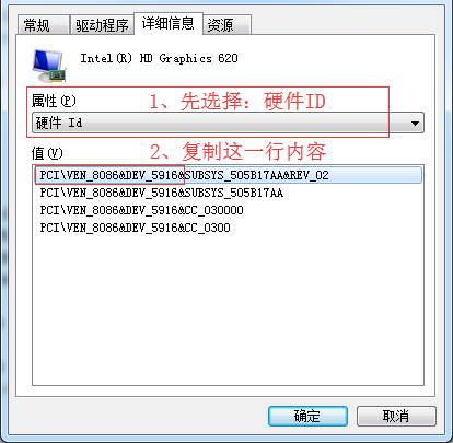 (注:如果实在找不到,可以下载一个Everything程序,直接输入第4点中的igdlh64.inf文件名,会在1秒钟内自动搜索到对应的文件夹) 4、在Graphics文件夹中,找到igdlh64.inf文件【备用】。 5、右键点击“计算机”-“属性”-“设备管理器”,在设备管理器里,找到未安装驱动的标准VGA显示适配器,右键,选择“属性”,然后点击:“详细信息”,在“属性”栏目下选择:“硬件id”,记录下ID:PCI\VEN_8086&DEV_5916,如下图: