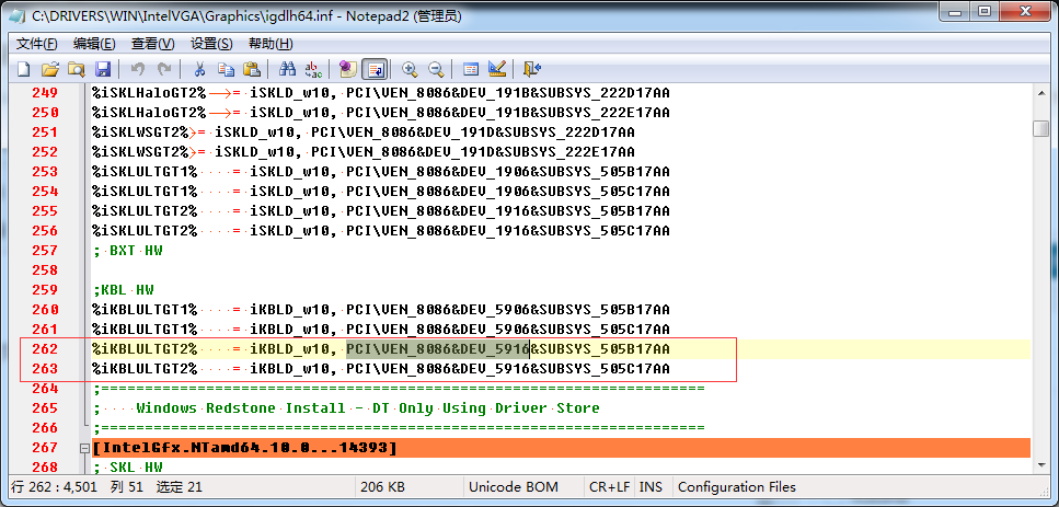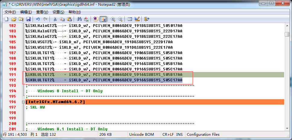 6、打开igdlh64.inf文件,用快捷键:Ctrl+F查找刚才记下的硬件ID,比如查找:PCI\VEN_8086&DEV_5916,显示结果如下: